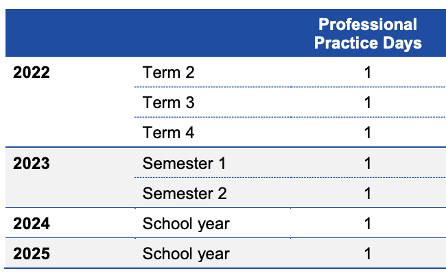 Teachers are entitled to be released from their scheduled duties for a certain number of Professional Practice Days each year. For instance, there will be three Professional Practice Days in 2022, two in 2023, and one in 2024 and each subsequent school year.
